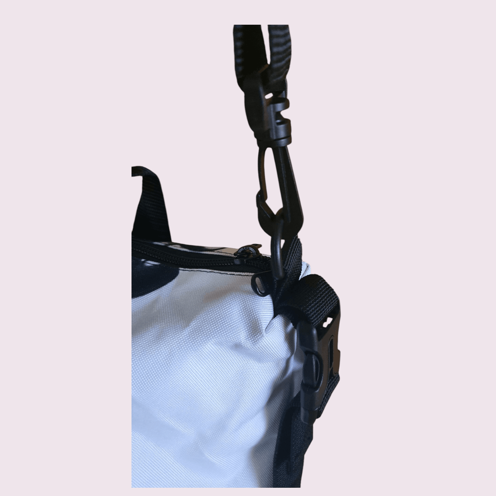 Borsa multiuso in materiale plastificato stampato,con manici e tracolla removibile tramite moschettoni.